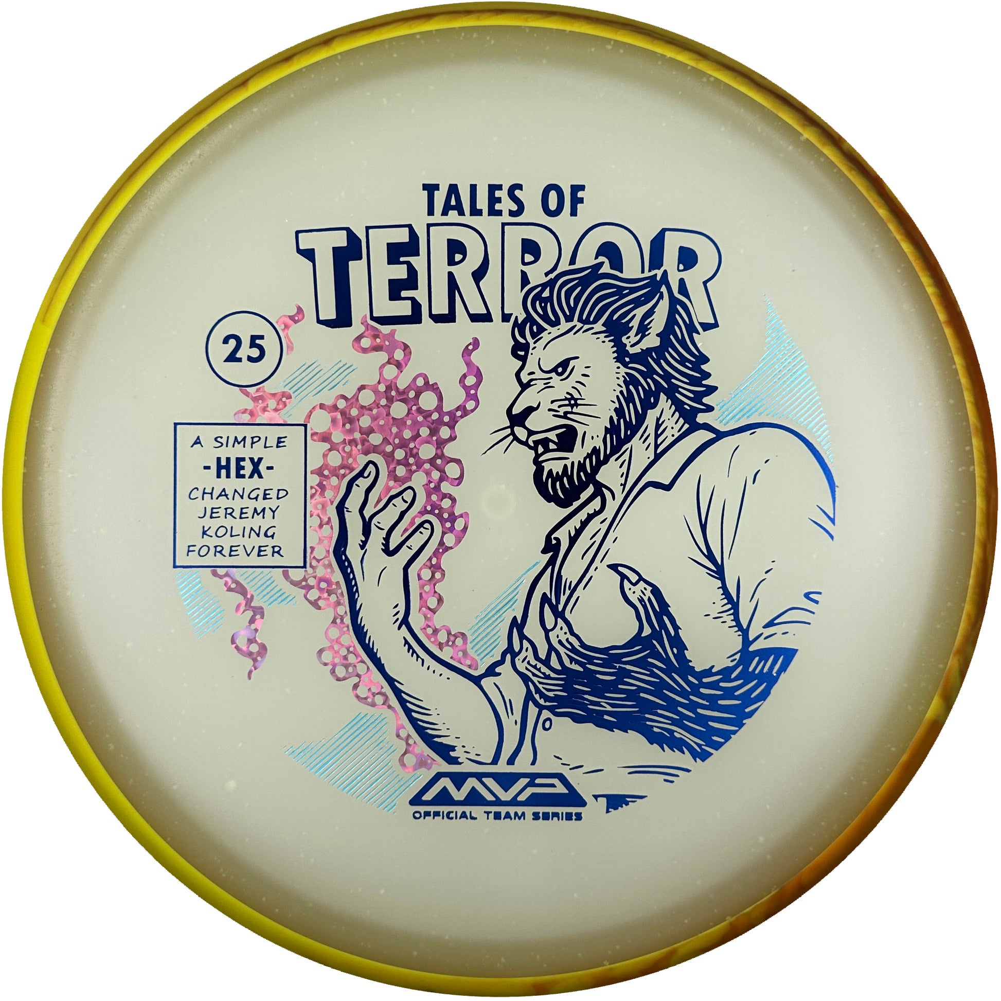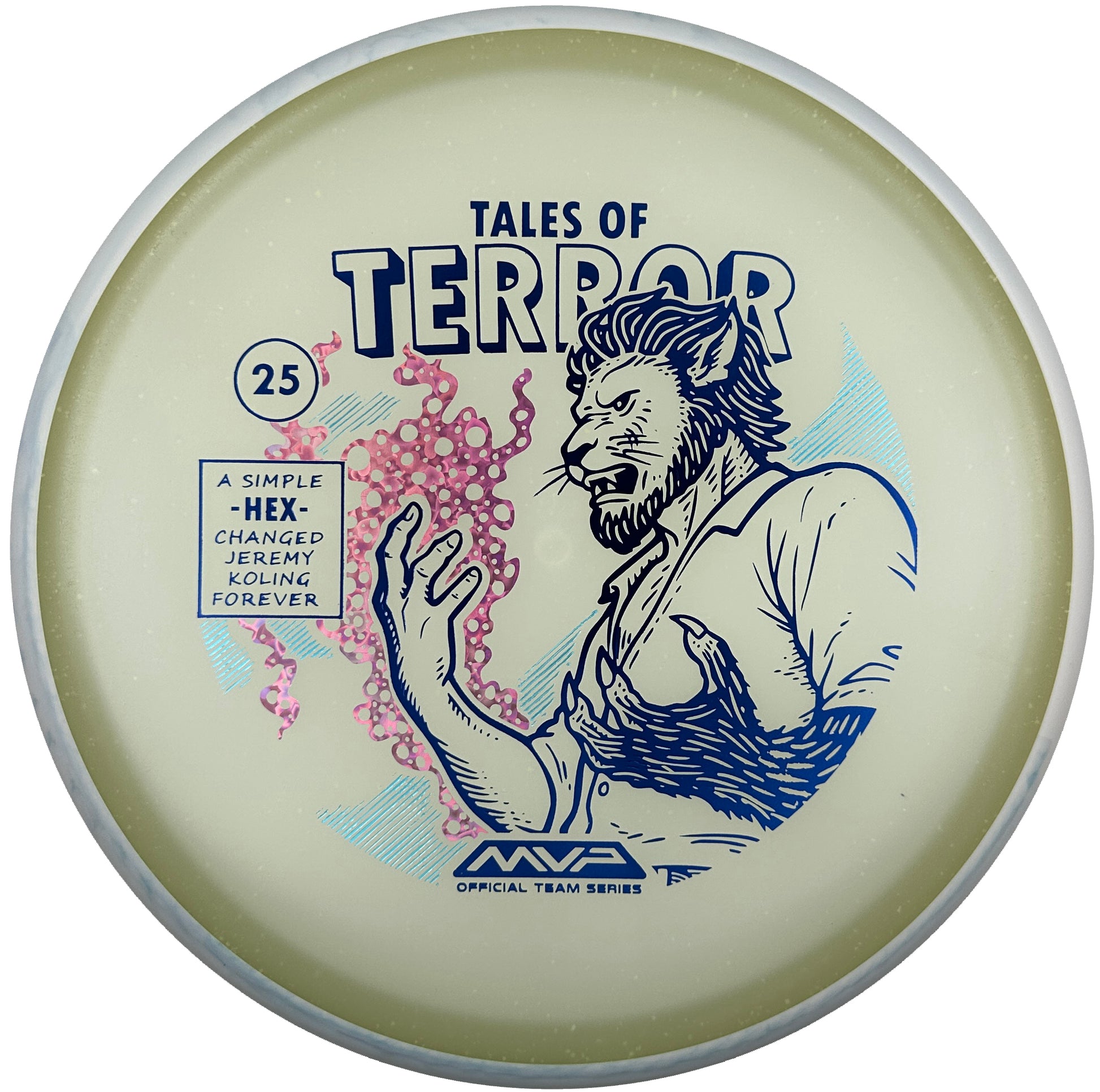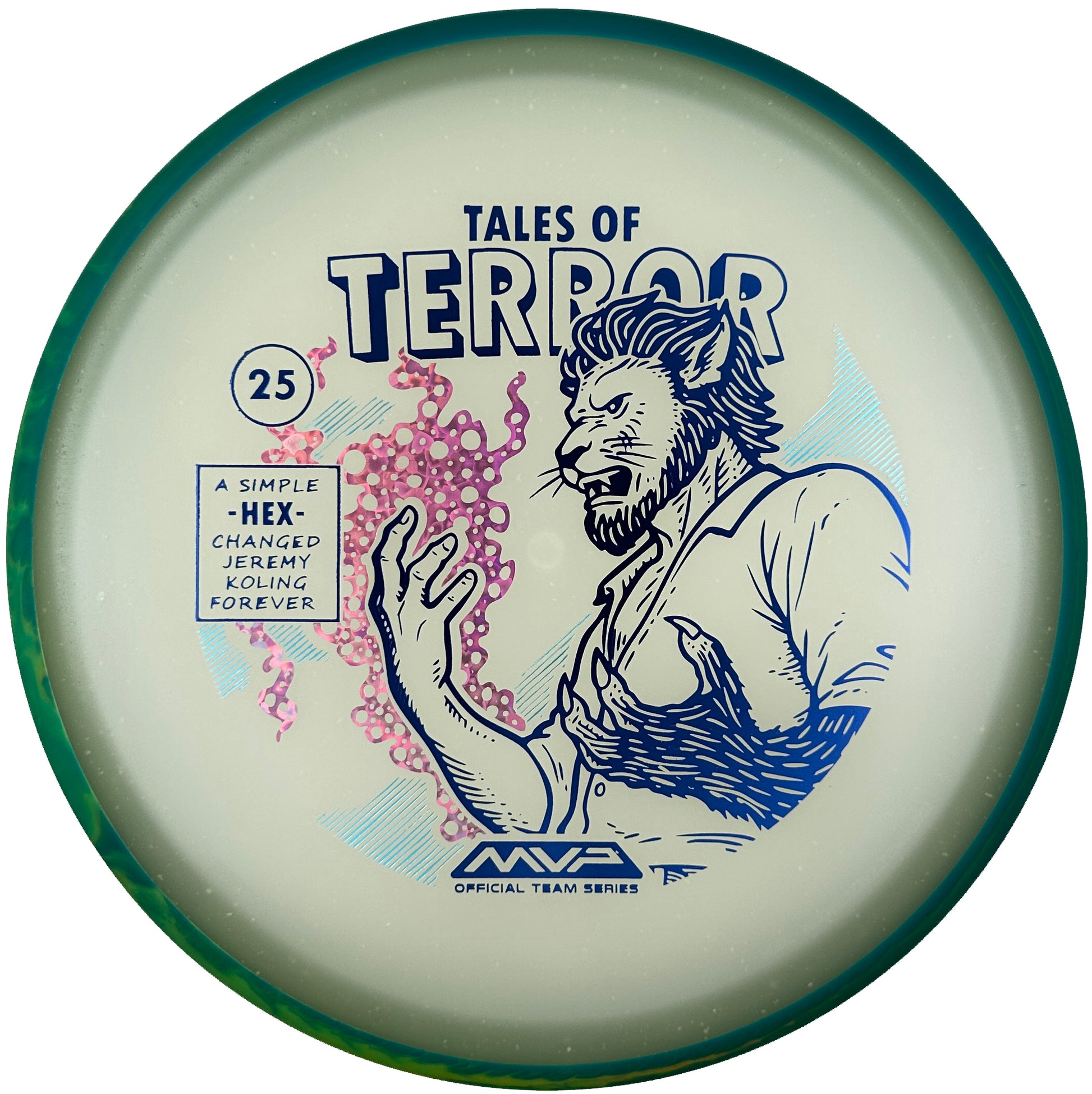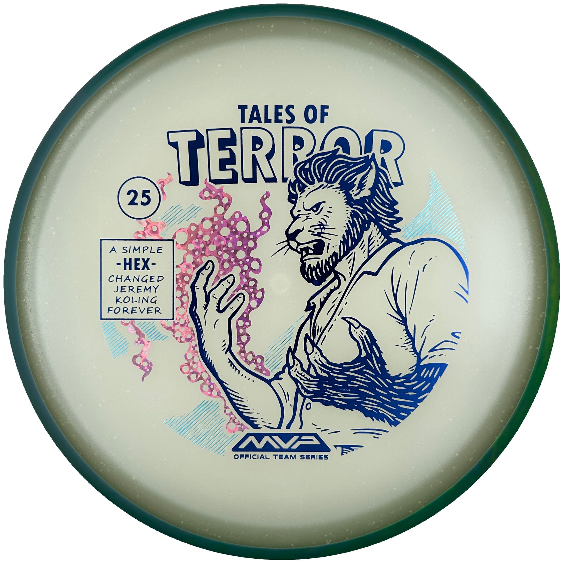DoubleRam Design shows us the terrifying alternate origin of Jeremy Koling’s childhood nickname - Lionheart - on the new Particle Eclipse Hex! Made with our industry-leading Eclipse plastic, this new blend of glow with colorful particles inside gives the disc its own magical feel. As a straight flying midrange, the Hex is set to become even more mesmerizing than before with its straight to understable flight allowing for exceptionally easy line shaping - showcasing why the Hex is one of the most versatile discs around. Unleash your inner beast and shred the course with the Particle Eclipse Hex, available at your favorite local or online MVP dealer!