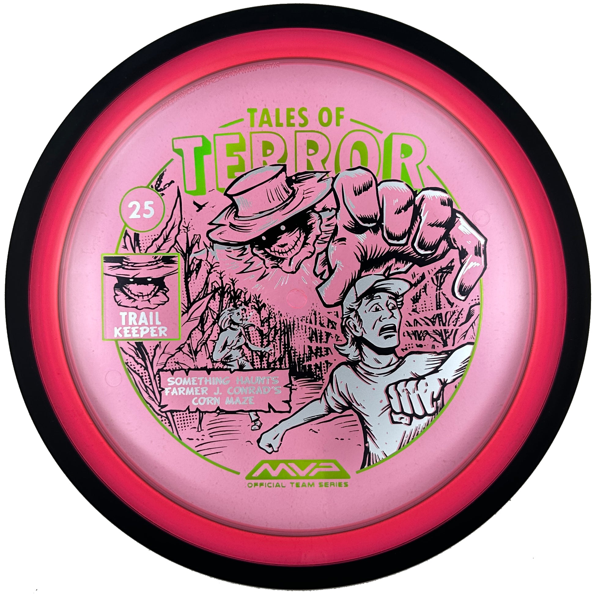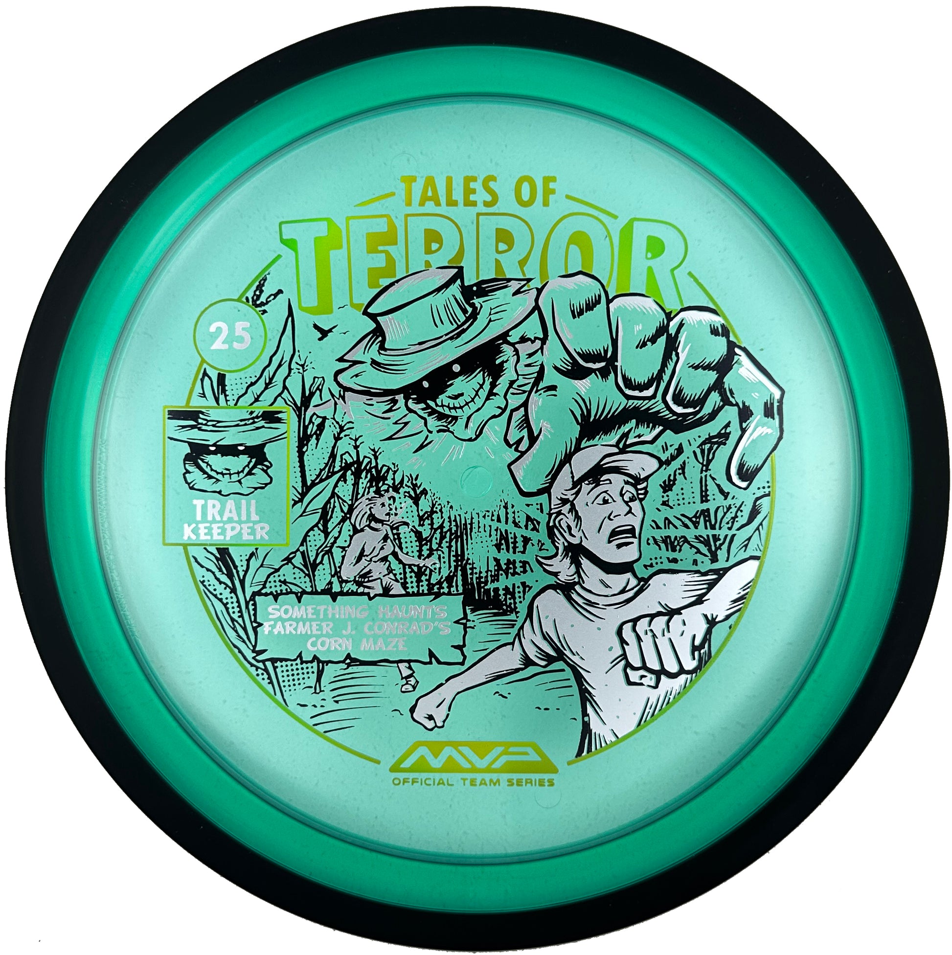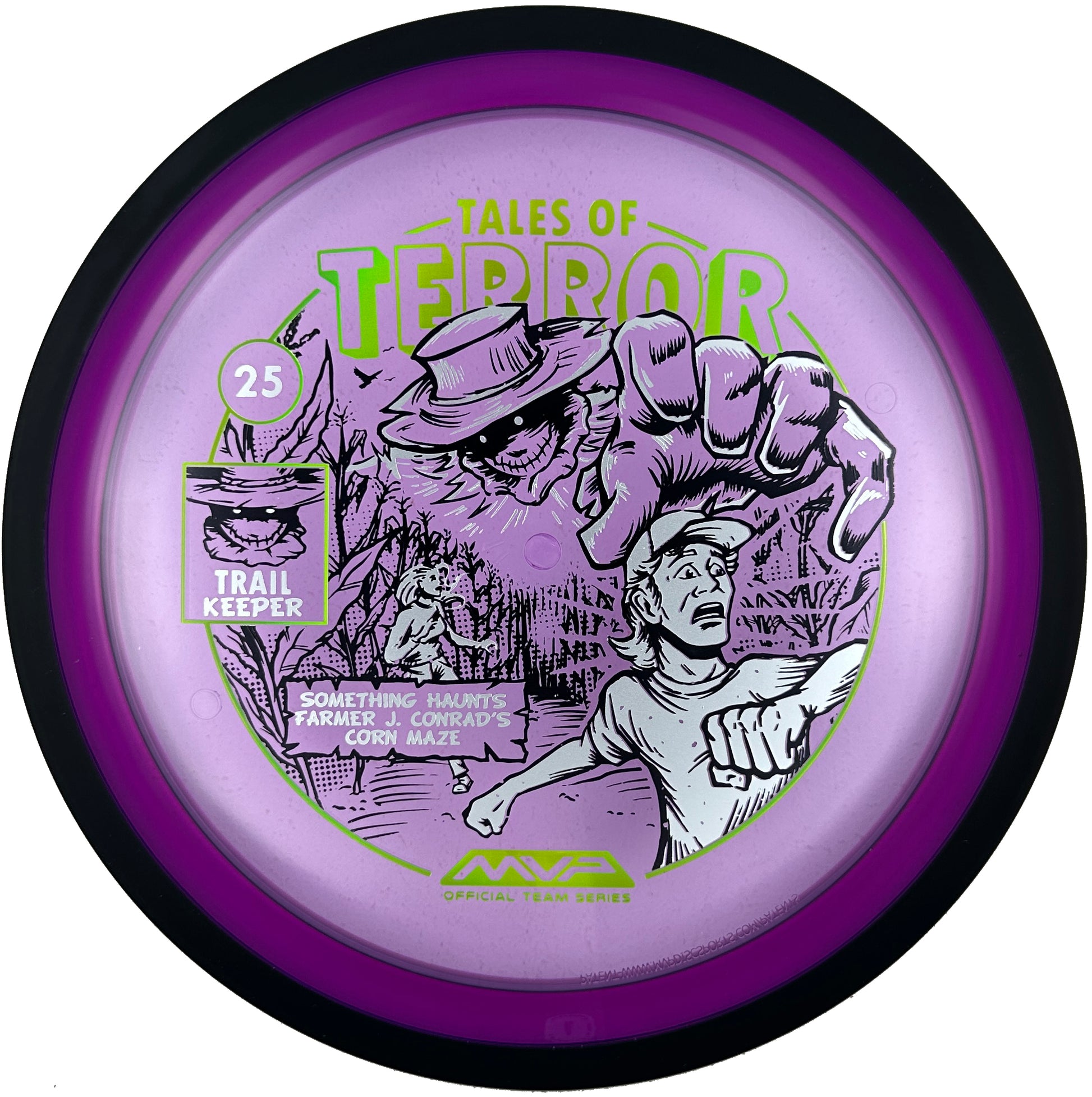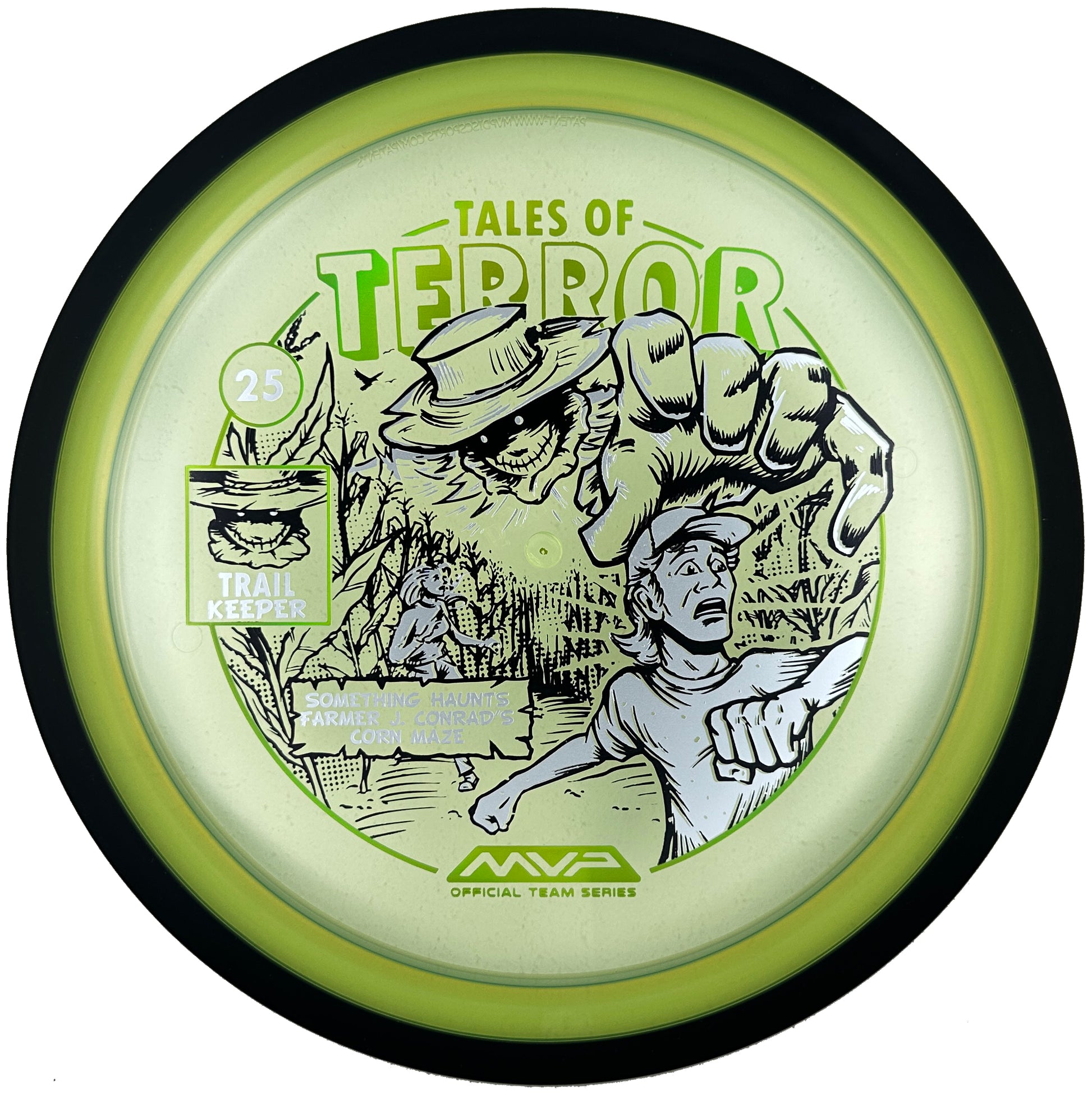 The highly requested fan favorite Proton Trail has returned! Green C Studio adorns this disc with a glimpse of the Trail Keeper haunting Conrad’s Corn Maze, a classic horror story. Excelling in hyzer-flip drives, turnovers, and straight shots, the Trail has become one of the most popular drivers in the MVP lineup that throwers of all power levels will find significant use for. You don’t have to get lost in a killer corn field to get your hands on one of these, just head over to your favorite local or online MVP dealer to get yours today!